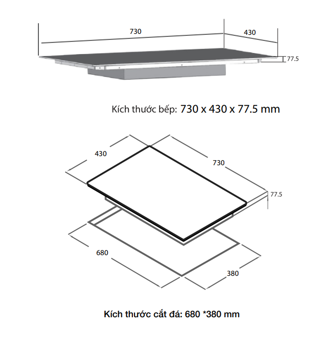 | Các chức năng an toàn | • Chức năng cảm ứng chống tràn • Chức năng cảnh báo nhiệt dư cho từng vùng nấu • Chức năng tự động tắt bếp khi nhấc nồi khỏi vùng nấu • Chức năng khóa trẻ em an toàn |
